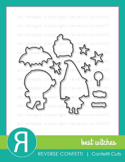 To create my card, I started off with a white card base. I cut a piece of Tangerine cardstock and a piece of patterned paper from the Fright Night patterned paper pad, to follow the sketch. I diecut the Insta-Frame Confetti Cuts from black cardstock and then cut a piece of watercolor paper to fit inside the frame. I used Chipped Sapphire and Wilted Violet distress inks to create an ink blended background, then splattered it with clean clear water to bleach out some areas. Then I stamped, colored and diecut images from the Best Witches stamp set and Too Cute to Spook stamp set to create my scene. I popped everything up with foam tape, the stamped a sentiment from Too Cute to Spook on a banner diecut from the Flowers for Mom Confetti Cuts dies set. Finally, I stamped a trio of stars from Best Witches in the upper right corner to follow the sketch.