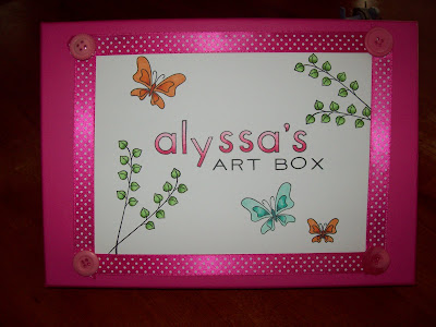 Hey there! My boys were invited to a birthday party this weekend, for a friend from school. SHE is turning 7. Now, I am the girliest of girls, but having two boys, I was stumped as far as what to do for a gift for her. In talking to her mom, I found out that she loves doing arts and crafts so I made her an art box and filled it with all kinds of great goodies!! :) I used a photo box and inside, she will find markers, colored pencils, crayons, watercolors, glitter pens, beads, pipe cleaners, stickers, letter stencils, ribbon and more! I wanted to personalize it, and this is what I ended up with...